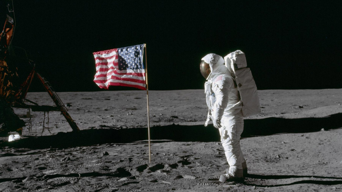 Базз Олдрин стоит рядом с флагом США на Луне.