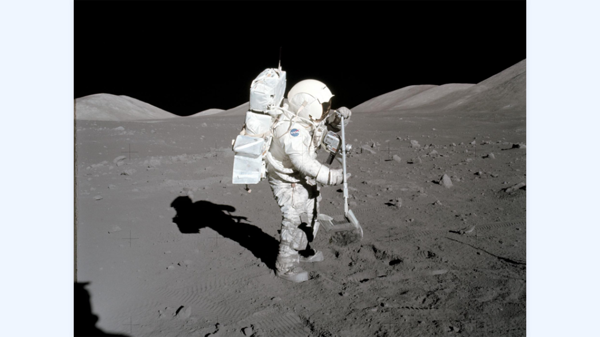 Астронавт Харрисон Шмитт собирает образцы лунного грунта.