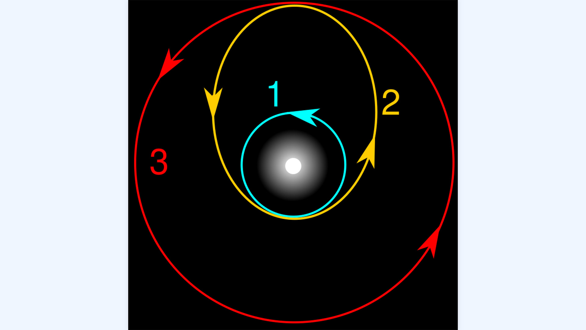 Гомановская траектория. 1 — орбита Земли; 2 — траектория полёта космического корабля; 3 — орбита Марса