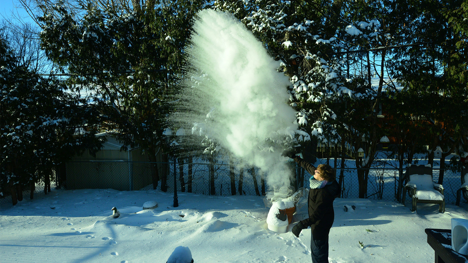 Если вы попробуете сделать то же самое с холодной водой, фокус не удастся. Испарение происходит в ней медленнее и воздух не сможет насытиться достаточным количеством пара для того, чтобы началась конденсация, за то время, что выплеснутая вода ещё не упала на землю. Скорее всего, вы просто получите лужу на снегу или льду.
