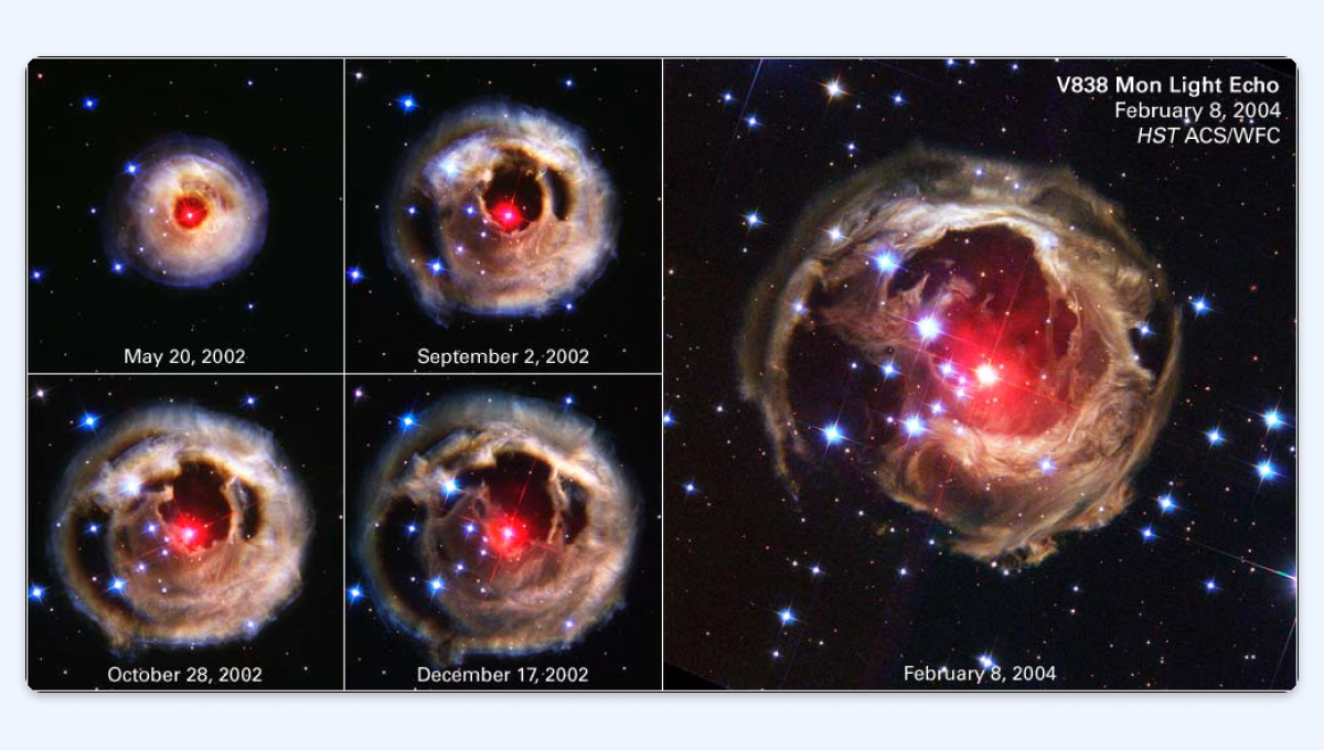 Фото расширяющегося светового эха от звезды V838 Mon, которое сторонники псевдонаучной гипотезы о Нибиру принимают за искомую планету