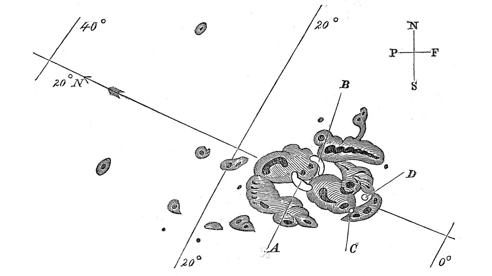Зарисовка солнечных пятен, сделанная Ричардом Кэррингтоном 1 сентября 1859 года