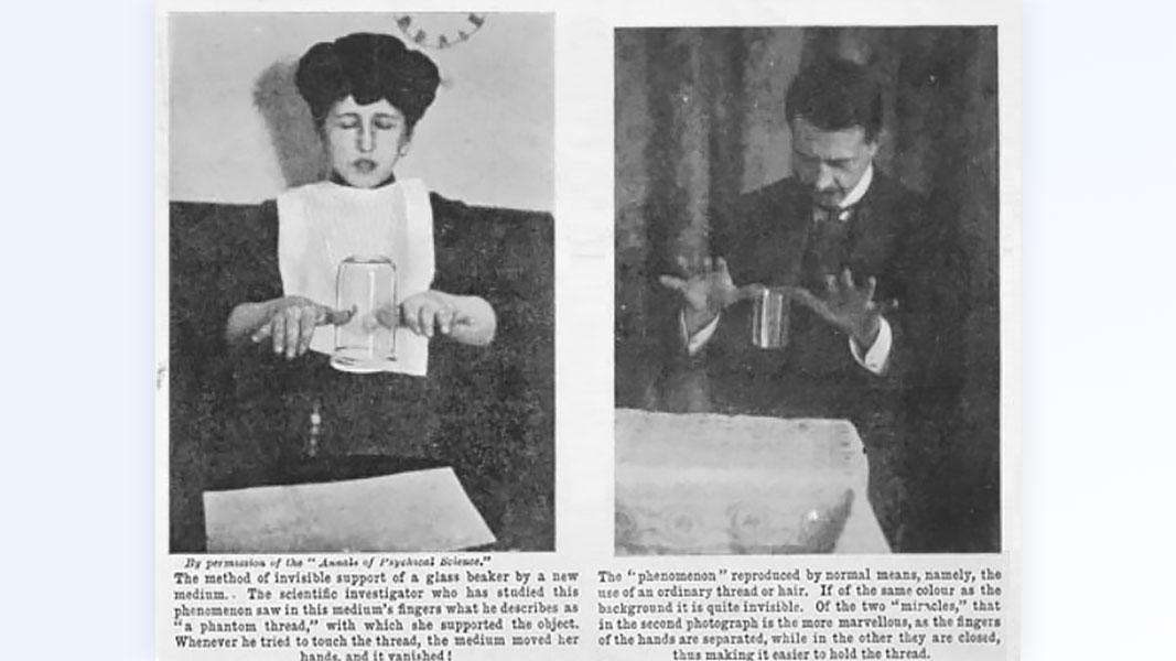 Фокусник Уильям Марриотт разоблачает трюк медиума Станиславы Томчик по левитации стеклянного стакана