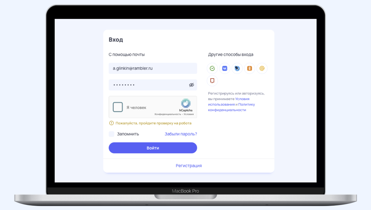 Почта «Рамблера» позволяет авторизоваться через Сбер ID, «ВКонтакте», «Одноклассники», «Живой Журнал», Mail.ru или портал Mos.ru. Покажем процедуру на примере Сбера, но в остальных случаях шаги будут практически идентичные.