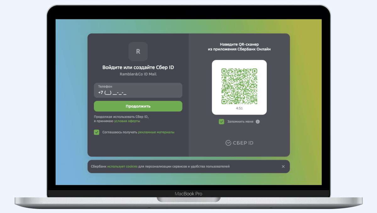 - В новом окне браузера вы увидите форму авторизации: либо введите свой номер телефона и потом вбейте СМС, либо зайдите в приложение Сбербанк Онлайн и отсканируйте QR-код.