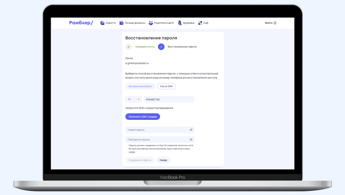 - Нажмите «Сохранить пароль». Если код из СМС правильный и оба введённых пароля совпадают, вы сможете войти в свою почту с помощью нового кода.