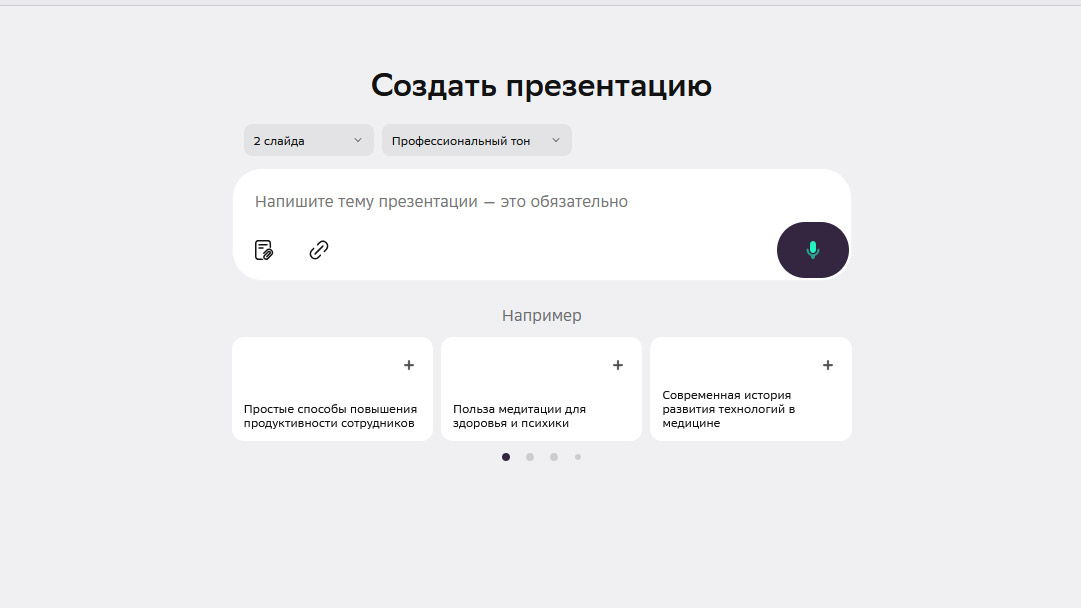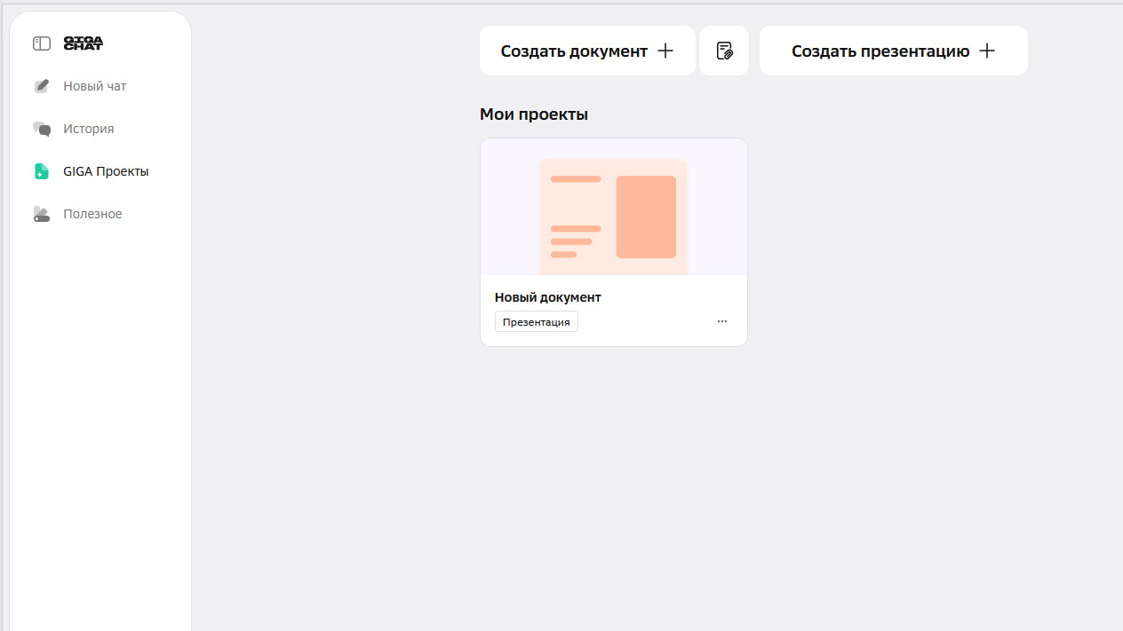Зайдите в веб-версию GigaChat и перейдите в раздел «GIGA Проекты» в меню слева. В открывшемся окне найдите кнопку «Создать презентацию». После того как вы её нажмёте, откроется окно, в котором нужно задать параметры вашей презентации.