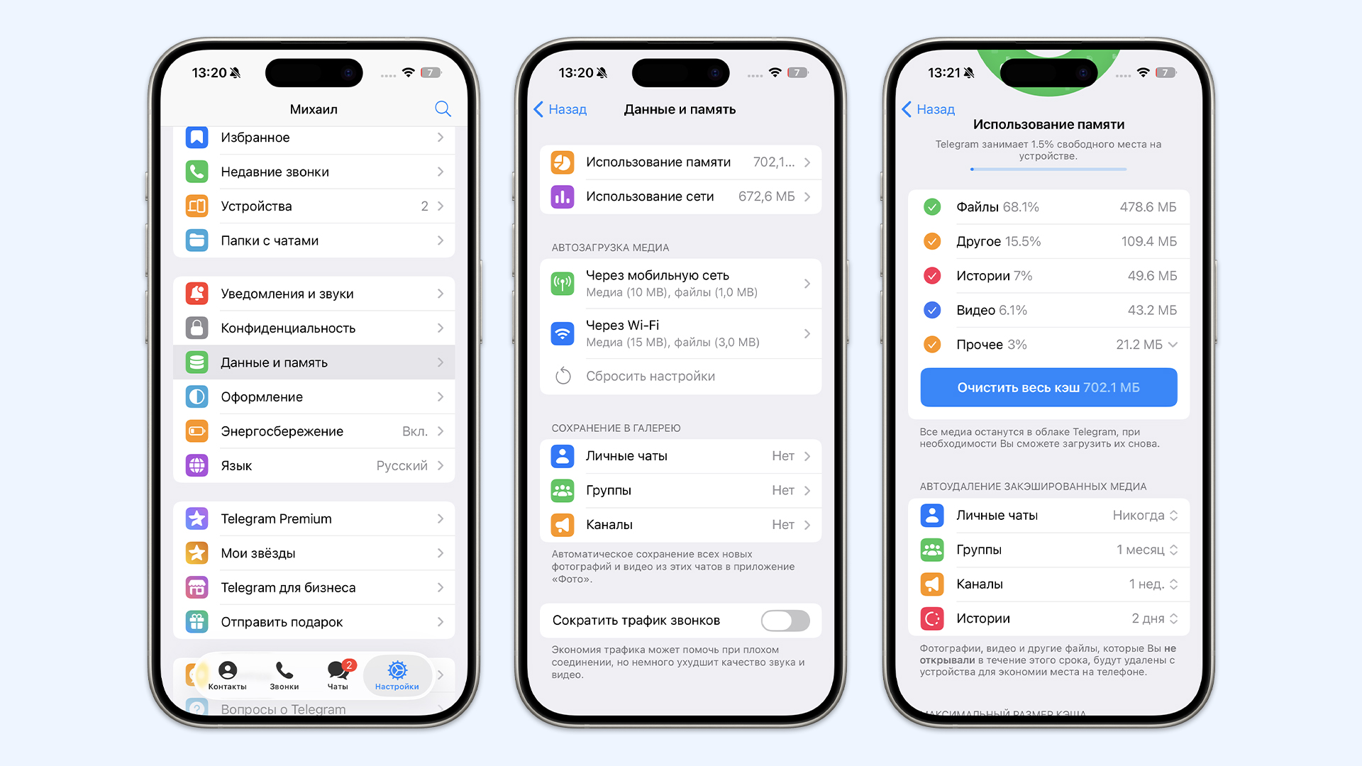 Конечно, есть и исключения — мессенджеры. Например, Telegram позволяет локально очищать кэш внутри самой программы. И это удобно, ведь такие приложения съедают десятки гигабайт, если за ними не следить. Чтобы очистить кэш в Telegram, перейдите в Настройки → Данные и память → Использование памяти → «Очистить кэш».