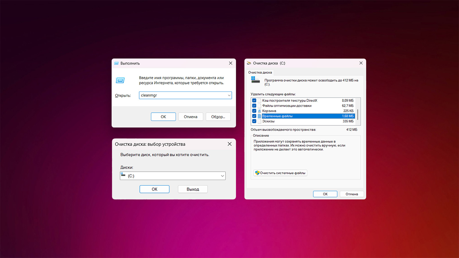 - Нажмите Win + R, введите cleanmgr и нажмите Enter.