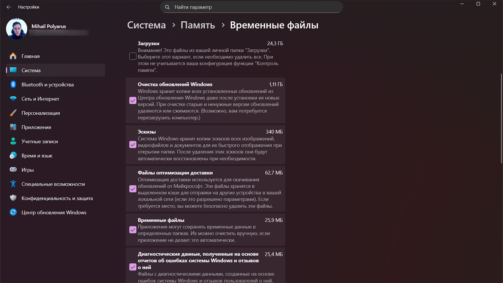 - Дополнительно нажмите «Очистить системные файлы» — система просканирует ненужные файлы и предложит их удалить.