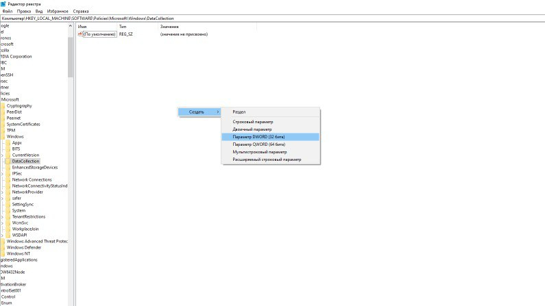 Дальнейший путь зависит от того, видите ли вы параметр AllowTelemetry или нет. Если нет, кликните на свободную область правой кнопкой мыши, выберите «Создать», а дальше — «Параметр DWORD (32 бита). Назовите файл AllowTelemetry.