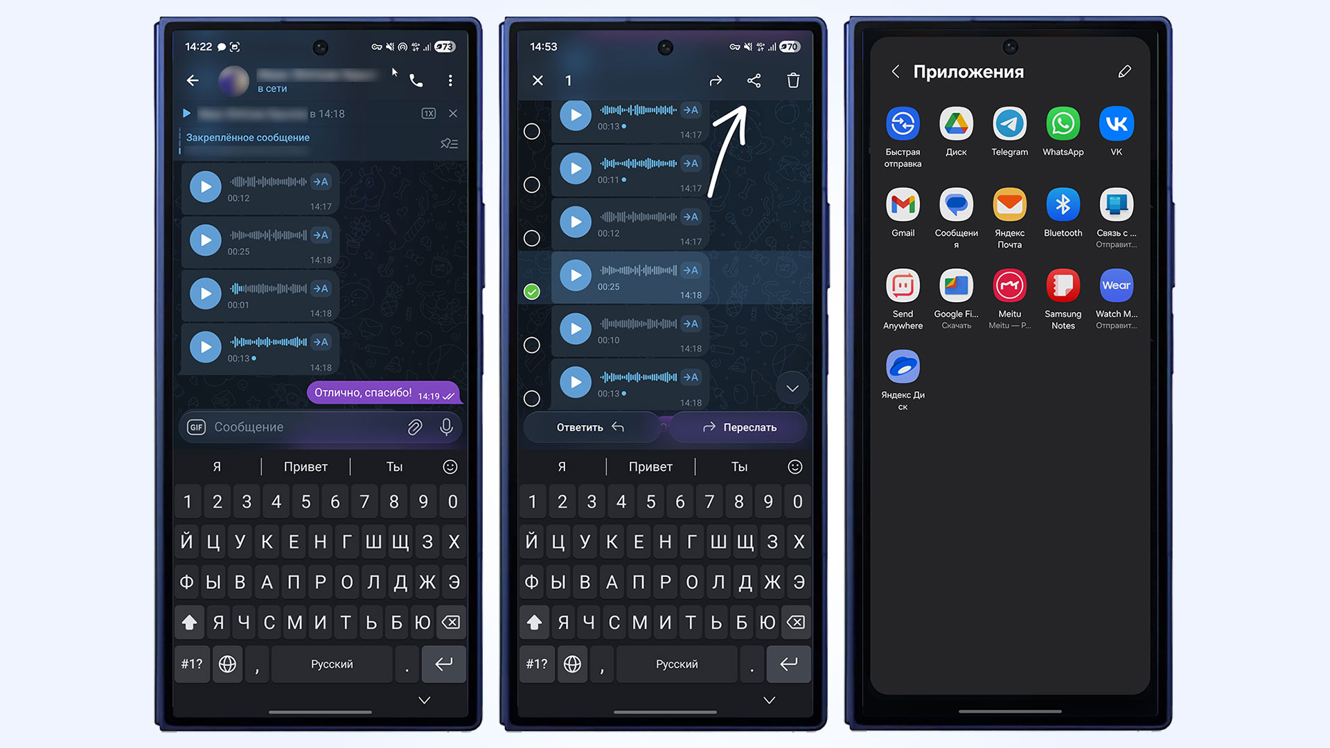 - Сделайте долгий тап для выбора, затем нажмите на иконку «Поделиться». Она находится в верхней части интерфейса Telegram.