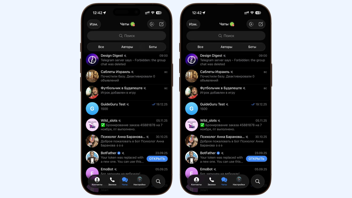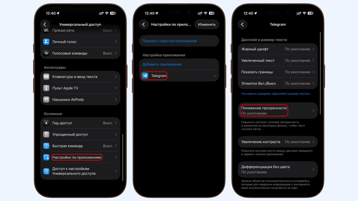 С первыми двумя проблемами вы ничего сделать не сможете, но третье ограничение можно обойти: «Универсальный доступ» позволяет убирать прозрачность точечно для каждого приложения на смартфоне. Например, у вас есть возможность выбрать одну или несколько программ, в которых Liquid Glass вам не нравится. Разберём на примере Telegram: