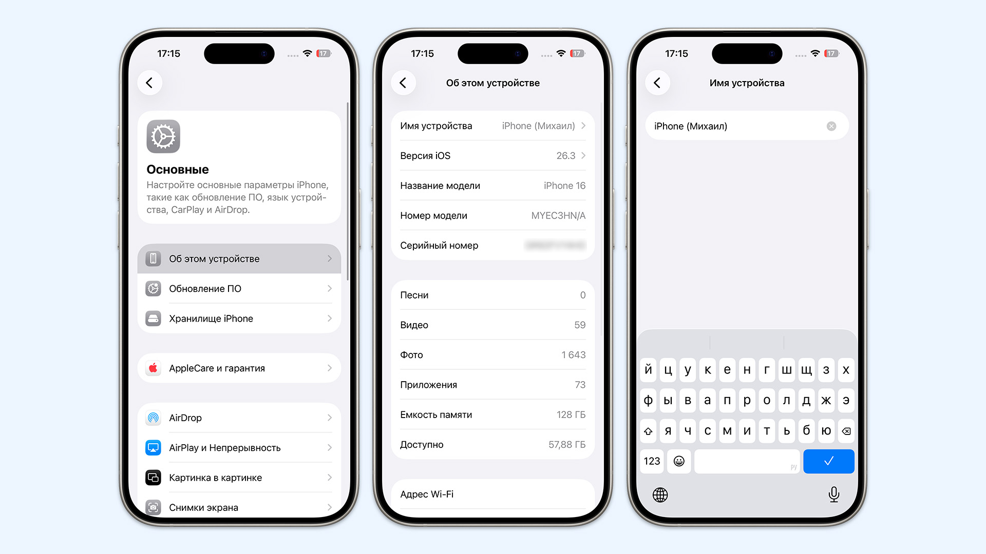 Если AirDrop работает некорректно и смартфон не видит iPhone друга, иногда решить проблему помогает переименование устройства. Зайдите в «Основные» → «Об этом устройстве» и измените имя iPhone. Это обновляет сетевой идентификатор в эфире и, как итог, при повторной попытке передать файлы через AirDrop iPhone отобразится на экране. Такую процедуру лучше сделать обоим участникам обмена файлами.