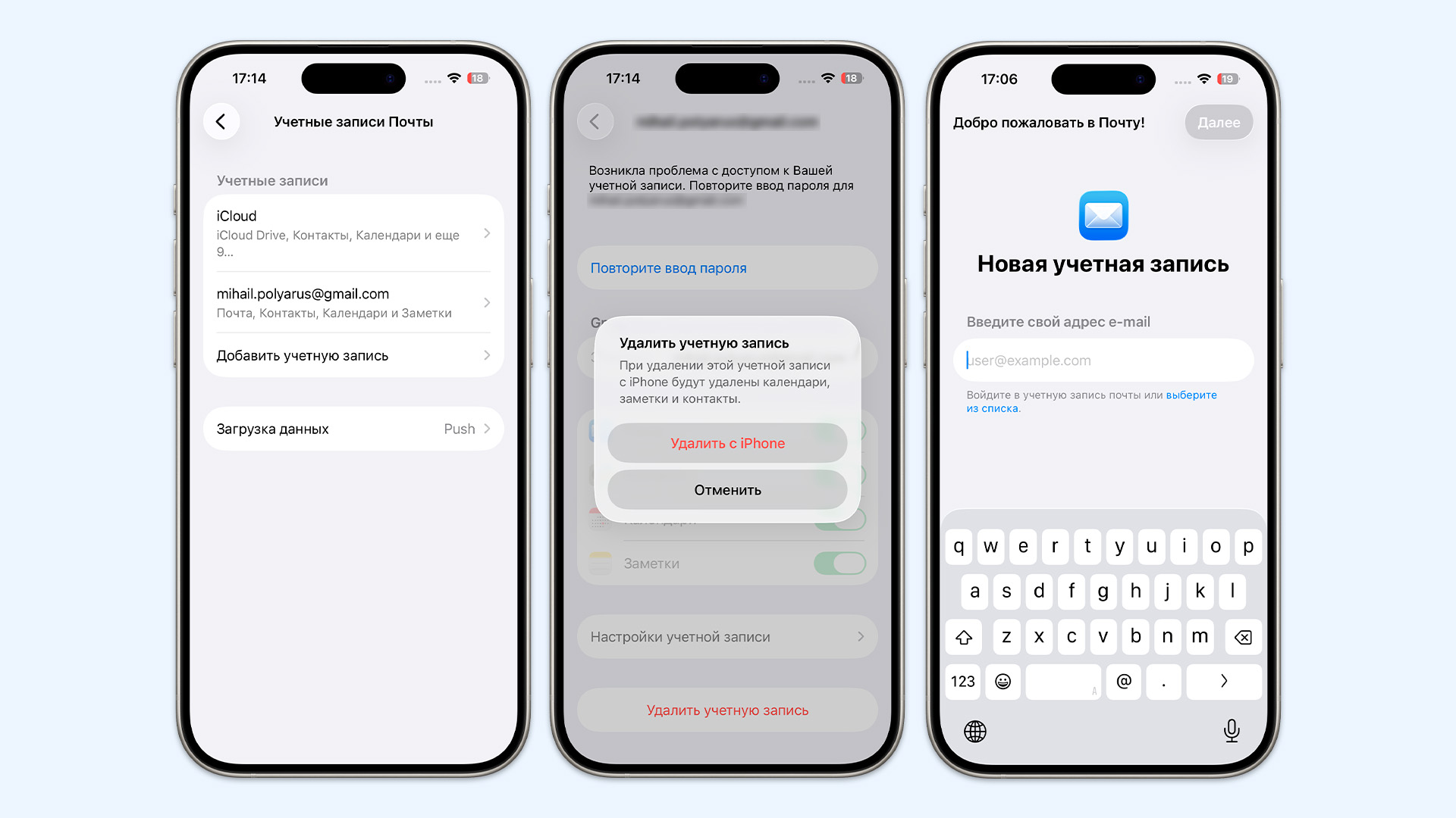 Наиболее простой способ это исправить — перезайти в учётную запись. Зайдите в «Настройки» → «Приложения» → «Почта» → «Учётные записи», выберите проблемный ящик, выйдите из этого аккаунта и войдите заново. Это заставит iPhone загрузить заголовки писем с нуля.