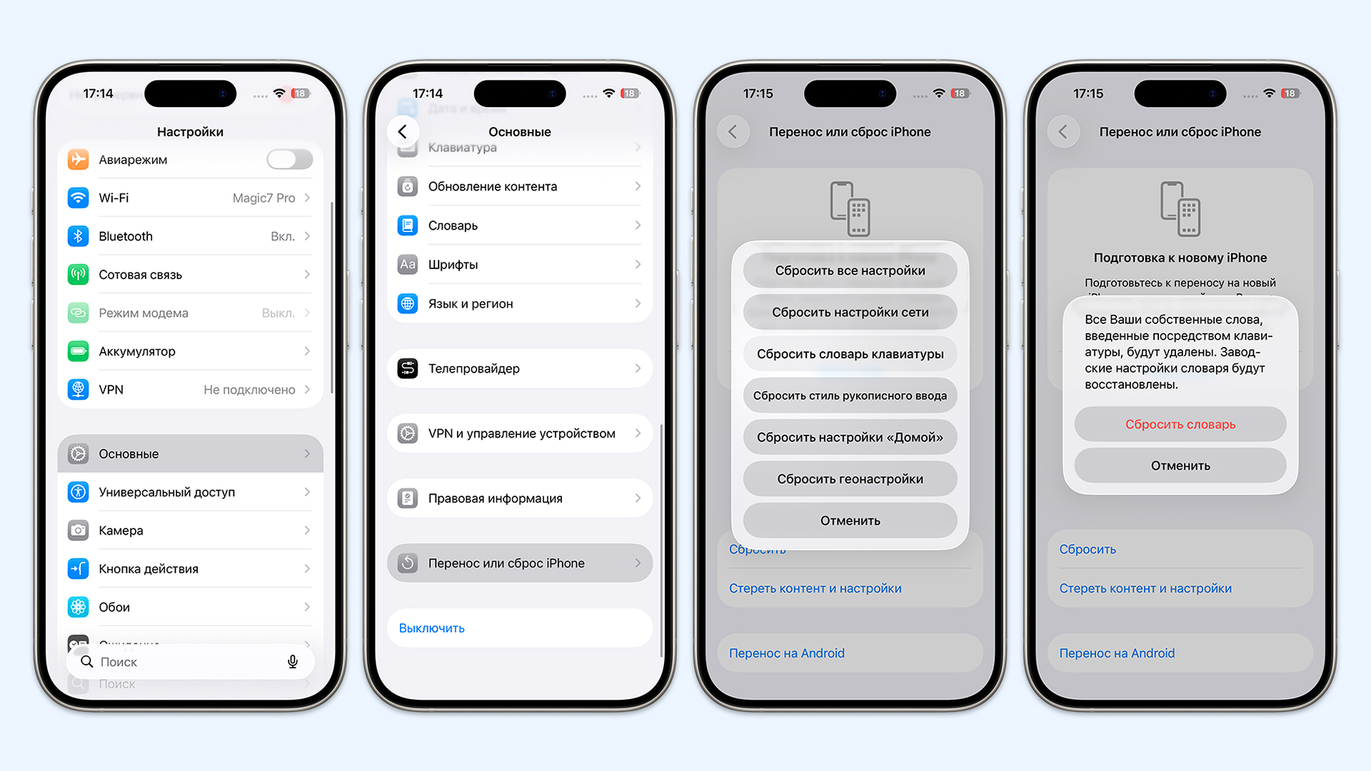 Способ исправить ошибку не менее радикальный, чем упорство, с которым разработчики её игнорируют. Если словарь «обучился» неправильно, сбросьте его: «Настройки» → «Основные» → «Перенос или сброс iPhone» → «Сброс» → «Сбросить словарь клавиатуры». Вы потеряете все сохраненные слова, однако можете решить проблему.