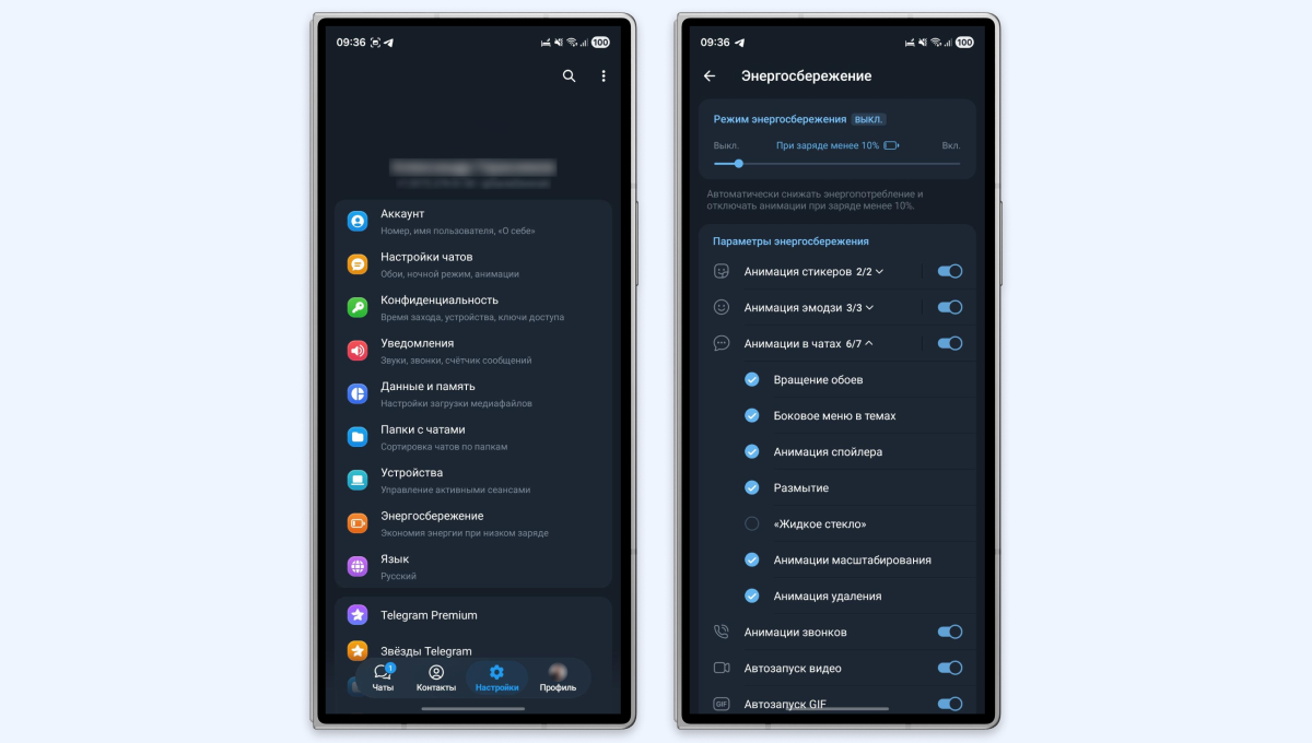 Также советуем изучить раздел «Энергосбережение» внимательно. В нём можно дополнительно отключить автоматическое воспроизведение видео, дополнительные анимации для звонков, спойлеров, удаления текста и так далее. Всё это поможет немного сэкономить заряд аккумулятора, если вы считаете, что Telegram слишком сильно влияет на время работы вашего смартфона.