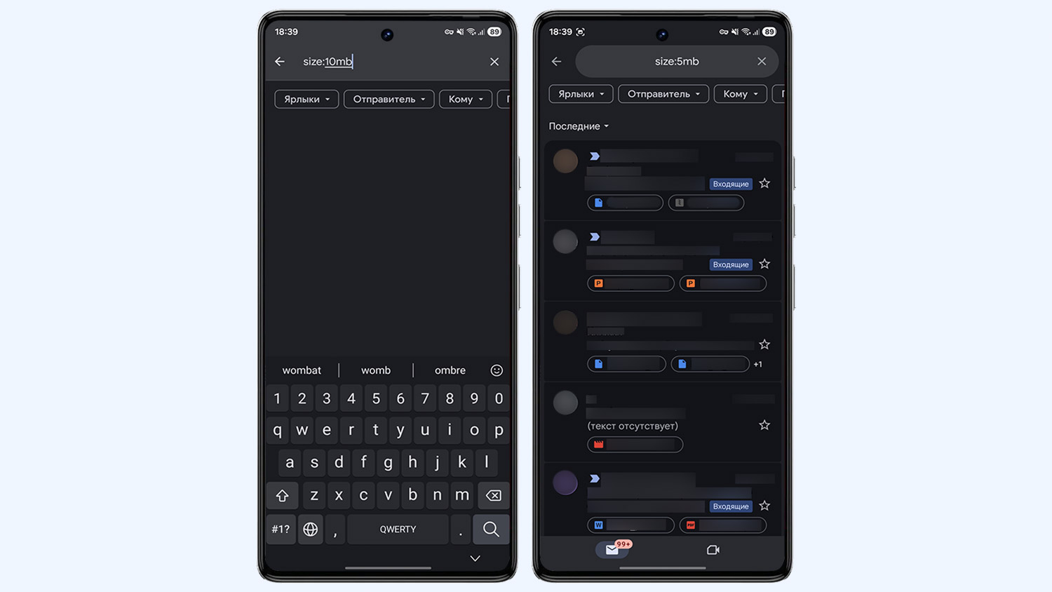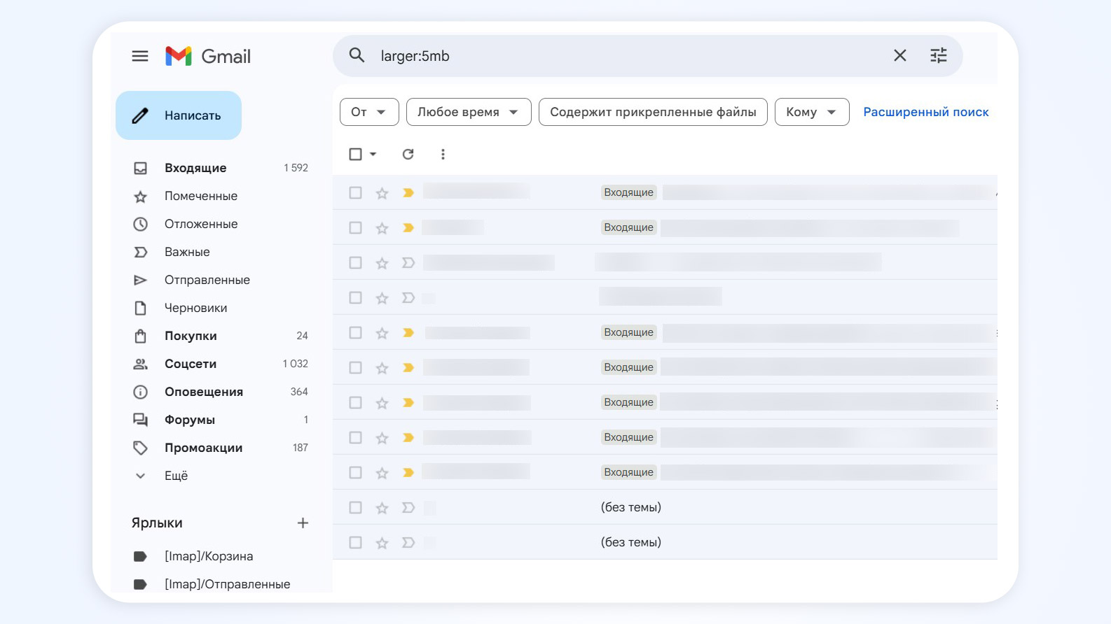 - В поисковую строку сверху введите size:10mb или larger:10mb. Появятся письма, которые весят больше 10 мегабайт.