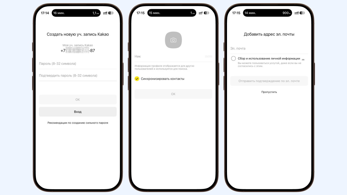 После отправки вернитесь в KakaoTalk и нажмите «Проверка верификации». Если всё хорошо, вам предложат создать новую учётную запись: придумать пароль, выбрать ник с аватаркой, синхронизировать контакты из телефонной книги и добавить адрес электронной почты (последнее — по желанию).