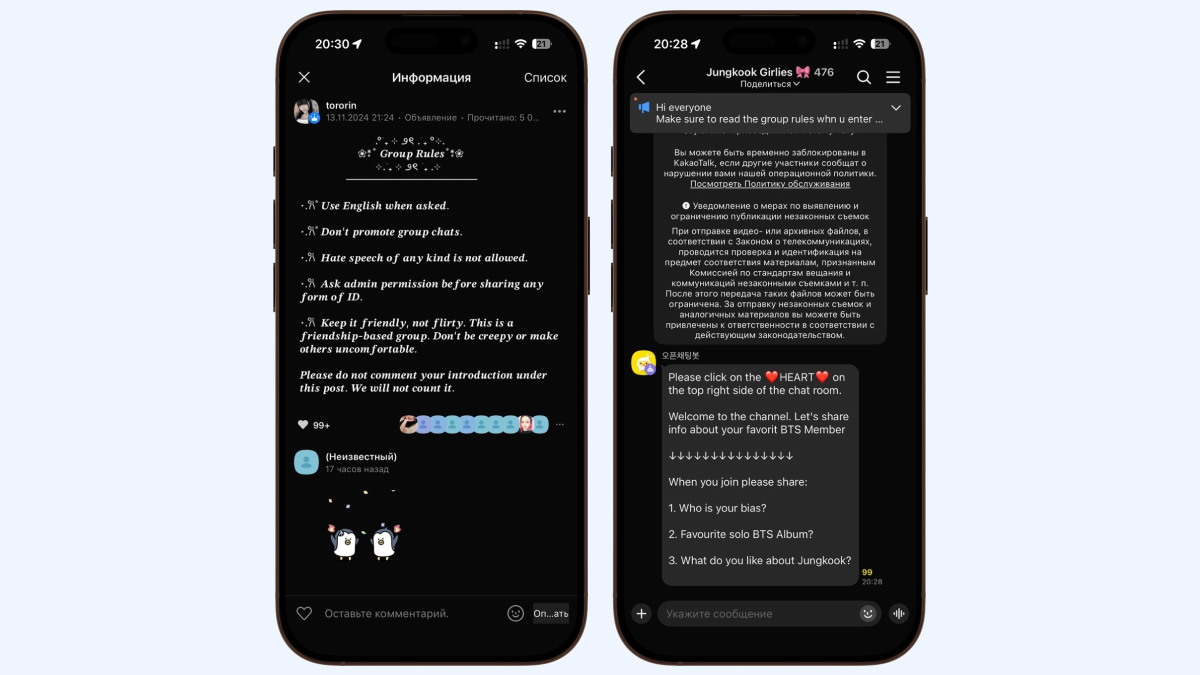Это тематические группы для общения с незнакомыми людьми по интересам. Например, если вам захочется обсудить с другими пользователями новинки кино или сложности изучения корейского языка, вы можете создать свой чат или найти чужой по тегам, ключевым словам или по прямой ссылке. Из ограничений — до 3 000 участников.
