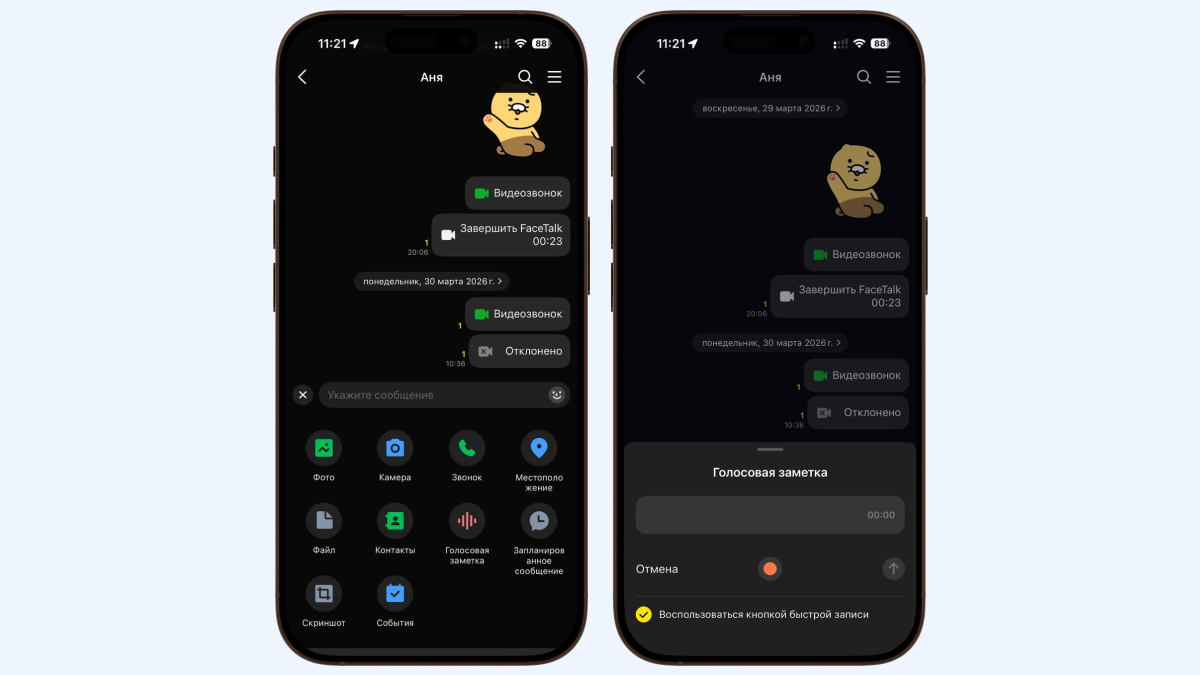 Помимо обычных сообщений, вы можете отправлять собеседникам документы, видео, фото, контакты, геометки и голосовые заметки — всё как в большинстве современных мессенджеров. Для этого просто нажмите на «плюсик» слева от строки ввода и выберите нужную функцию. Запланированные сообщения тоже есть: удобная функция, если вы, например, хотите заранее подготовить напоминание другу или работаете в разных часовых поясах с коллегами.